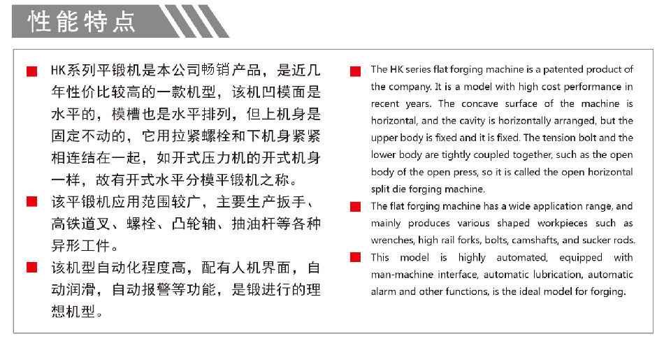 HK系列平鍛機,是近幾年性價比較高的一-款機型,該機凹模面是水平的,模槽也是水平排列,但上機身是固定不動的,它用拉緊螺栓和下機身緊緊相連結在一-起,如開式壓力機的開式機身-樣,故有開式水平分模平鍛機之稱。該平鍛機應用范圍較廣,主要生產扳手、高鐵道叉、螺栓、凸輪軸、抽油桿等各種異形工件。
